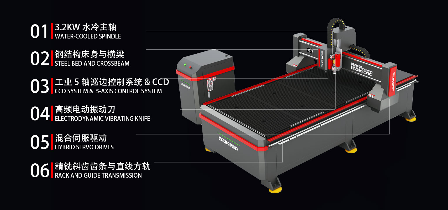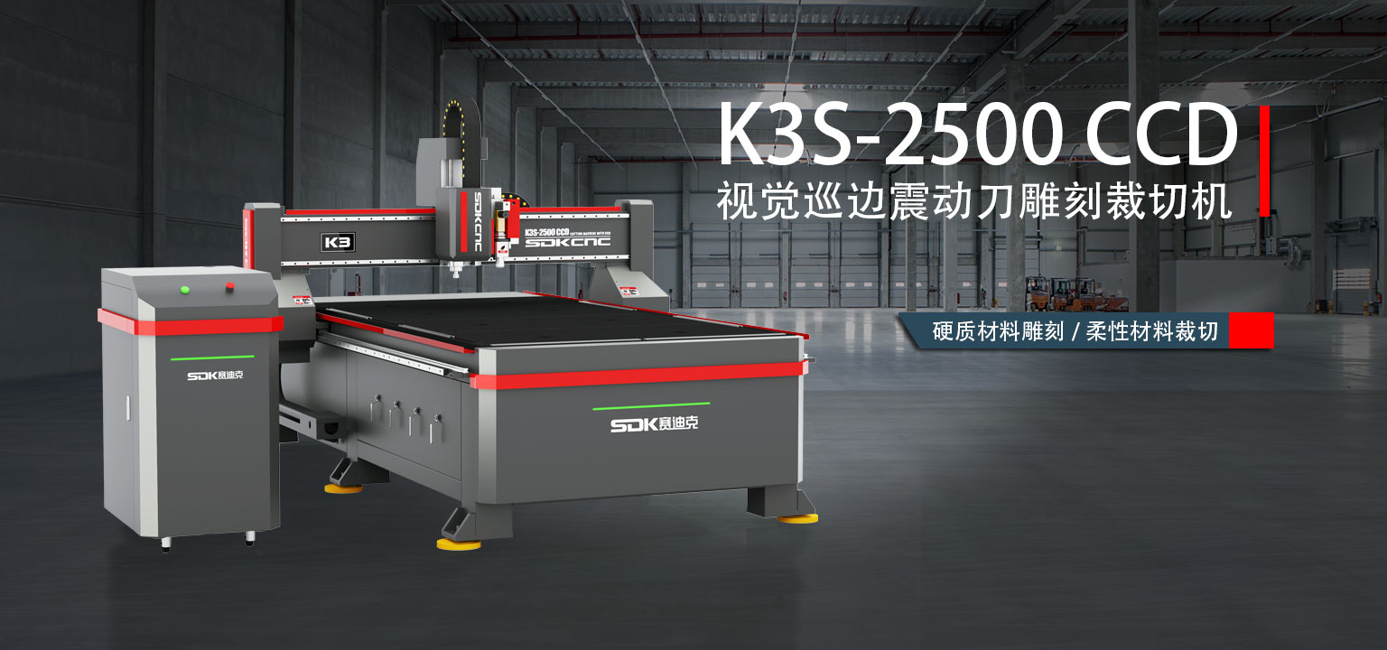 K3S-2500 CCD is a visual edge cutting machine independently developed and produced by SDKCNC, equipped with high-frequency vibration knife as standard, which is capable of cutting flexible and rigid materials at the same time, with industrial 5-axis edge motion control system, intelligent picking up of contours, and one-key automatic white-edge-free cutting, which is widely used in the processing fields of shaped edges and complex patterns in the industries of advertising signs, sliding doors and soft packages, furniture, display cabinets, architectural models, metal curtain walls, shoes, hats, bags, garment samples, printing and packaging, etc. It is widely used in the processing of shaped edges and complex patterns in advertising signs, sliding doors and soft packages, furniture, display cabinets, architectural models, metal curtain walls, shoes, hats and bags, garment samples, printing and packaging industries.